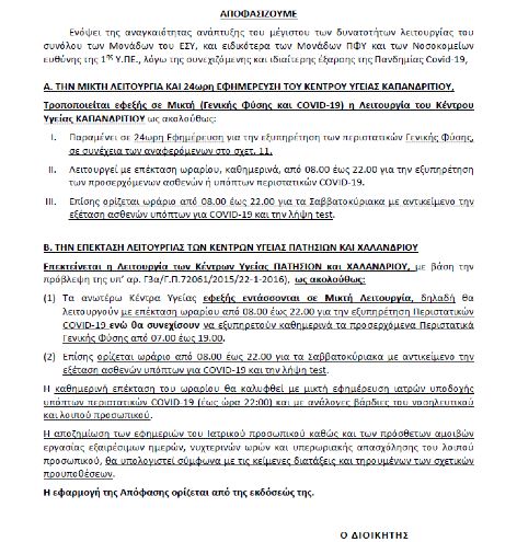 Συγκεκριμένα αποφασίστηκε η Μεικτή λειτουργία (Γενικής Φύσης και COVID-19) και 24ωρη εφημέρευση του Κέντρου Υγείας Καπανδριτίου.