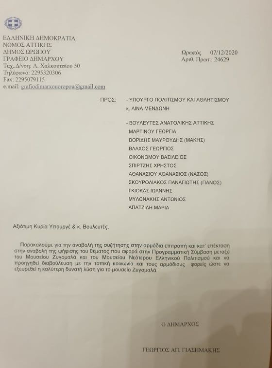 Ο δήμαρχος Ωρωπού Γιώργος Γιασημάκης με έγγραφα που απέστειλε στην Υπουργό Πολιτισμού κα. Λίνα Μενδώνη τα οποία κοινοποιήθηκαν σε όλους τους Βουλευτές της Ανατολικής Αττικής, ζήτησε την αναβολή της συζήτησης στην αρμόδια Επιτροπή και κατ΄επέκταση την αναβολή της ψήφισης του άρθρου του νομοσχεδίου στη Βουλή που αφορά στην Προγραμματική Σύμβαση μεταξύ του Μουσείου Ζυγομαλά και του Μουσείου Νεότερου Ελληνικού Πολιτισμού. Πρόταση του ήταν να προηγηθεί διαβούλευση με την τοπική κοινωνία και τους αρμόδιους φορείς για να εξευρεθεί η καλύτερη δυνατή λύση για το Μουσείο Ζυγομαλά.