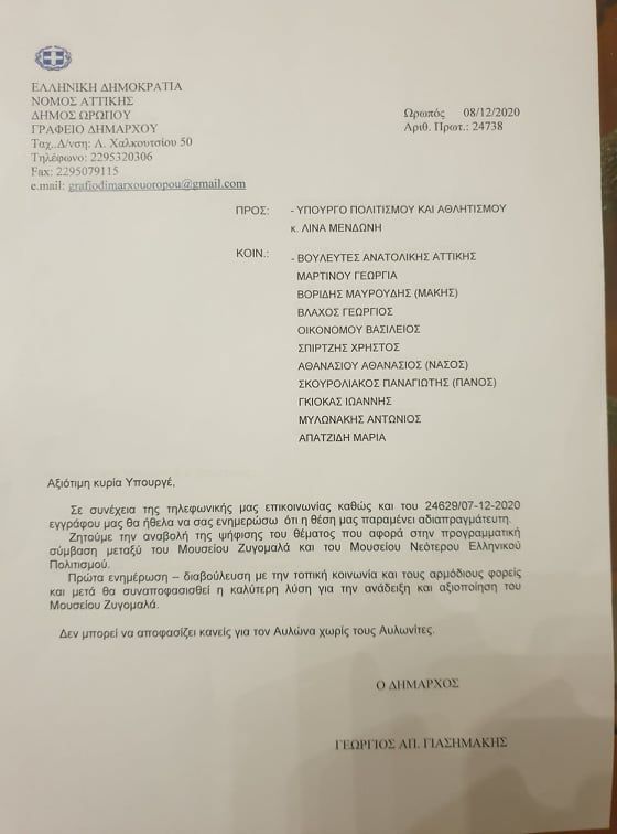 Η πρώτη επιστολή στάλθηκε στις 7 Δεκεμβρίου 2020. Ακολούθησαν τηλεφωνικές επικοινωνίες του Δημάρχου Ωρωπού με την Υπουργό Πολιτισμού χωρίς να υπάρξει αποτέλεσμα και στάλθηκε νέα επιστολή στην οποία ο Γιώργος Γιασημάκης αφού επανέλαβε το αίτημα και την πάγια θέση του Δήμου τονίζει προς την κα.Λίνα Μενδώνη: