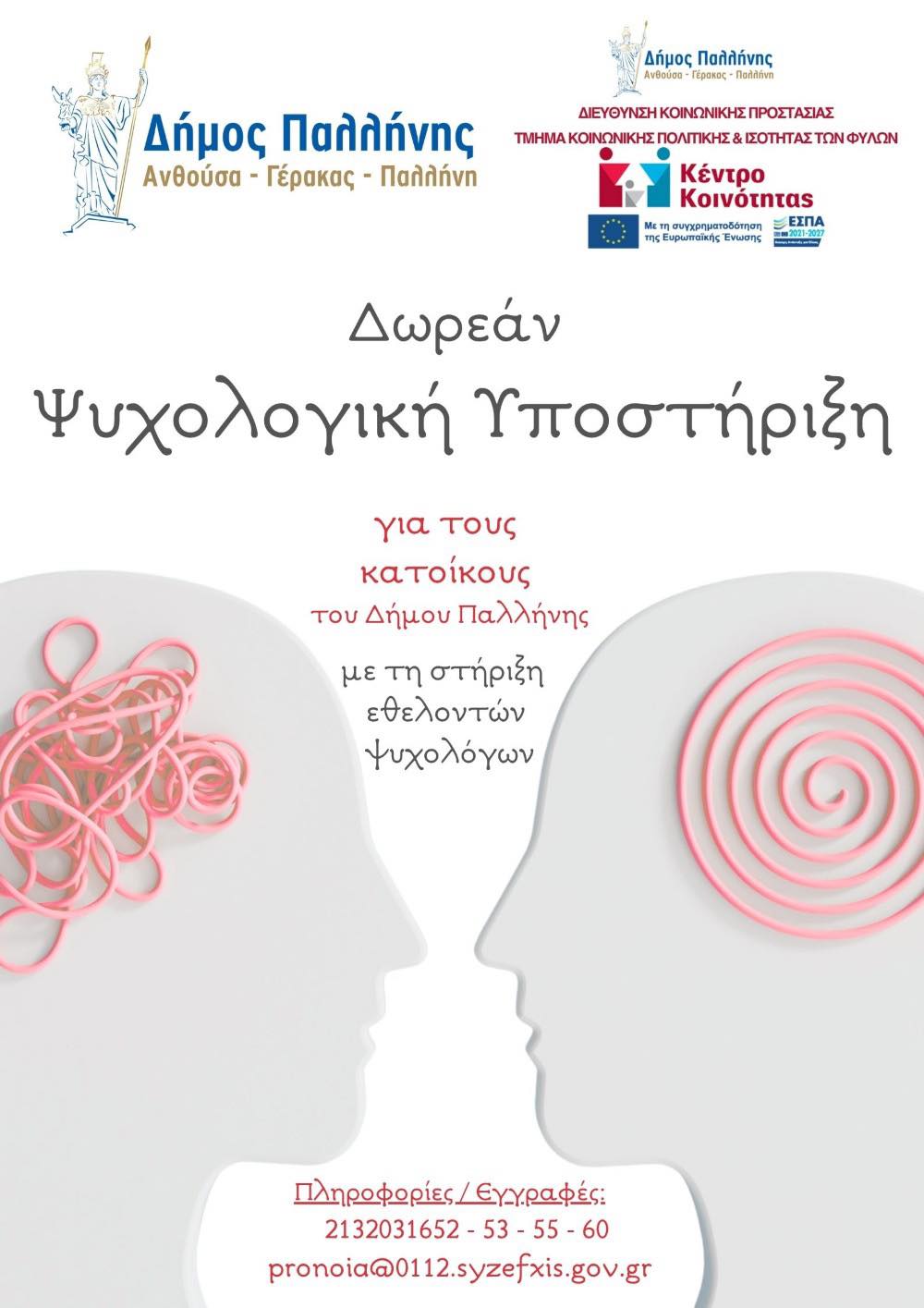 Ο Δήμος Παλλήνης επεκτείνει τις δράσεις του στον τομέα της ψυχικής υγείας, προσφέροντας δωρεάν Ψυχολογική Υποστήριξη σε όλους τους κατοίκους.