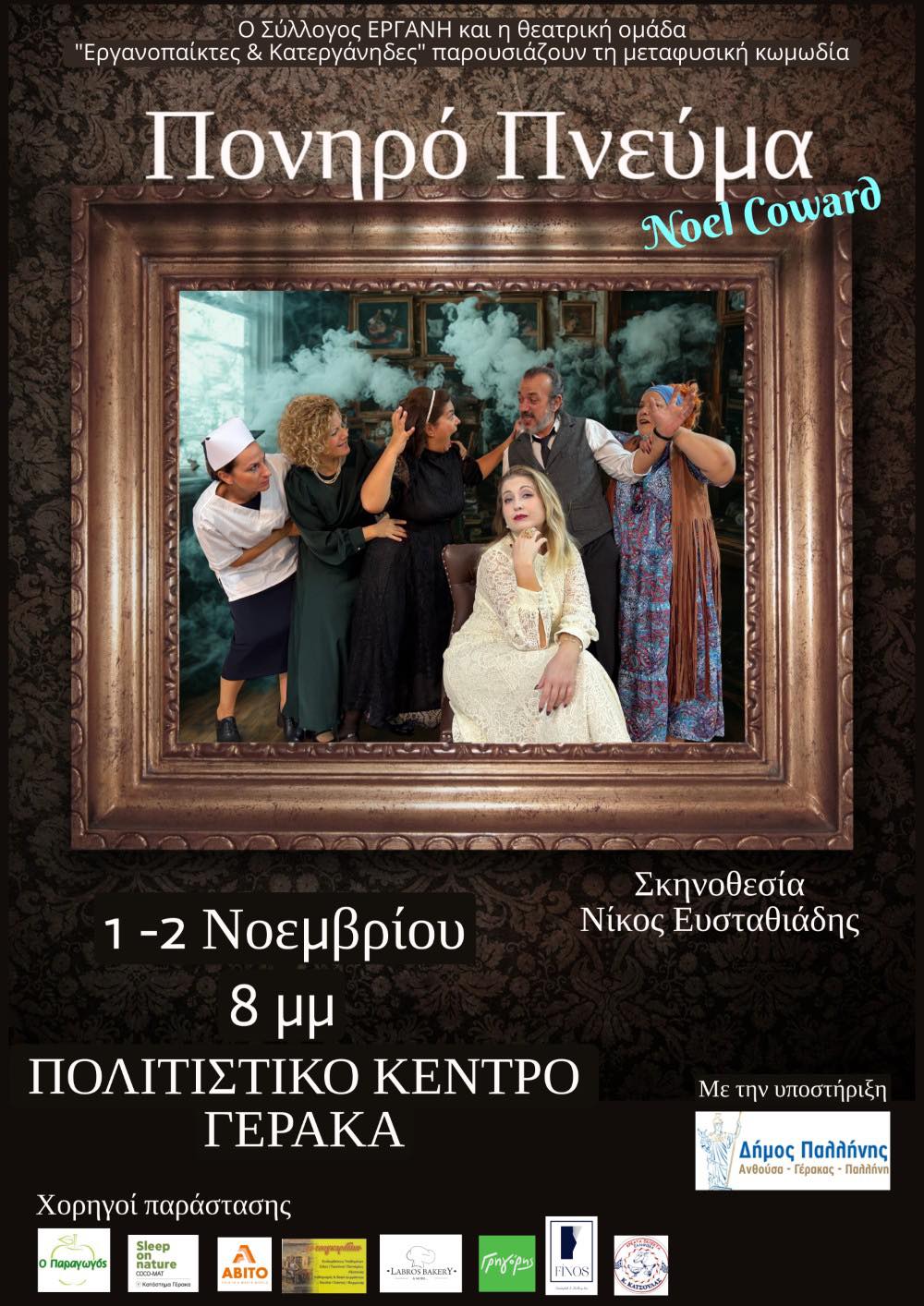 Η θεατρική ομάδα του Συλλόγου «Εργάνη» παρουσιάζει την κωμωδία «Πονηρό Πνεύμα» στο Πολιτιστικό Κέντρο Γέρακα – 1 & 2 Νοεμβρίου 2025.