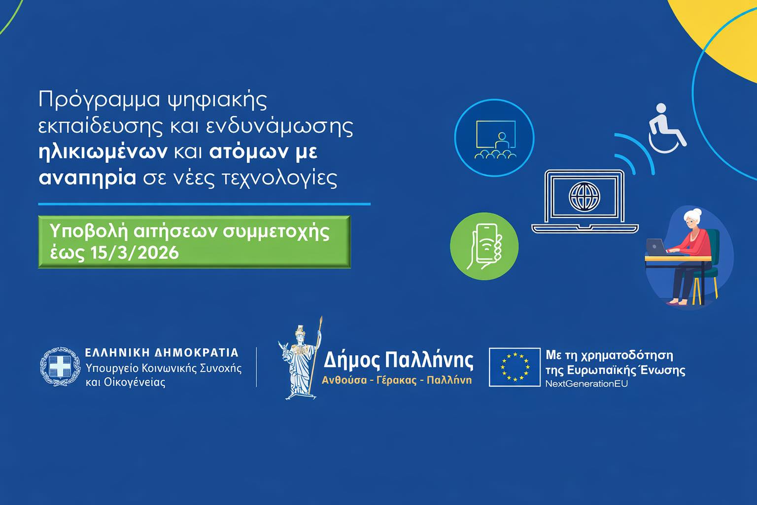 Ο Δήμος Παλλήνης, μέσω του Τμήματος Κοινωνικής Πολιτικής και Ισότητας Φύλων, ενημερώνει τους δημότες ότι βρίσκεται σε εξέλιξη η διαδικασία υποβολής αιτήσεων για το πρόγραμμα «Όλοι Digital», που υλοποιείται από το Υπουργείο Κοινωνικής Συνοχής και Οικογένειας με την υποστήριξη του Υπουργείο Ψηφιακής Διακυβέρνησης και σε συνεργασία με το Εθνικό Δίκτυο Υποδομών Τεχνολογίας και Έρευνας (ΕΔΥΤΕ).