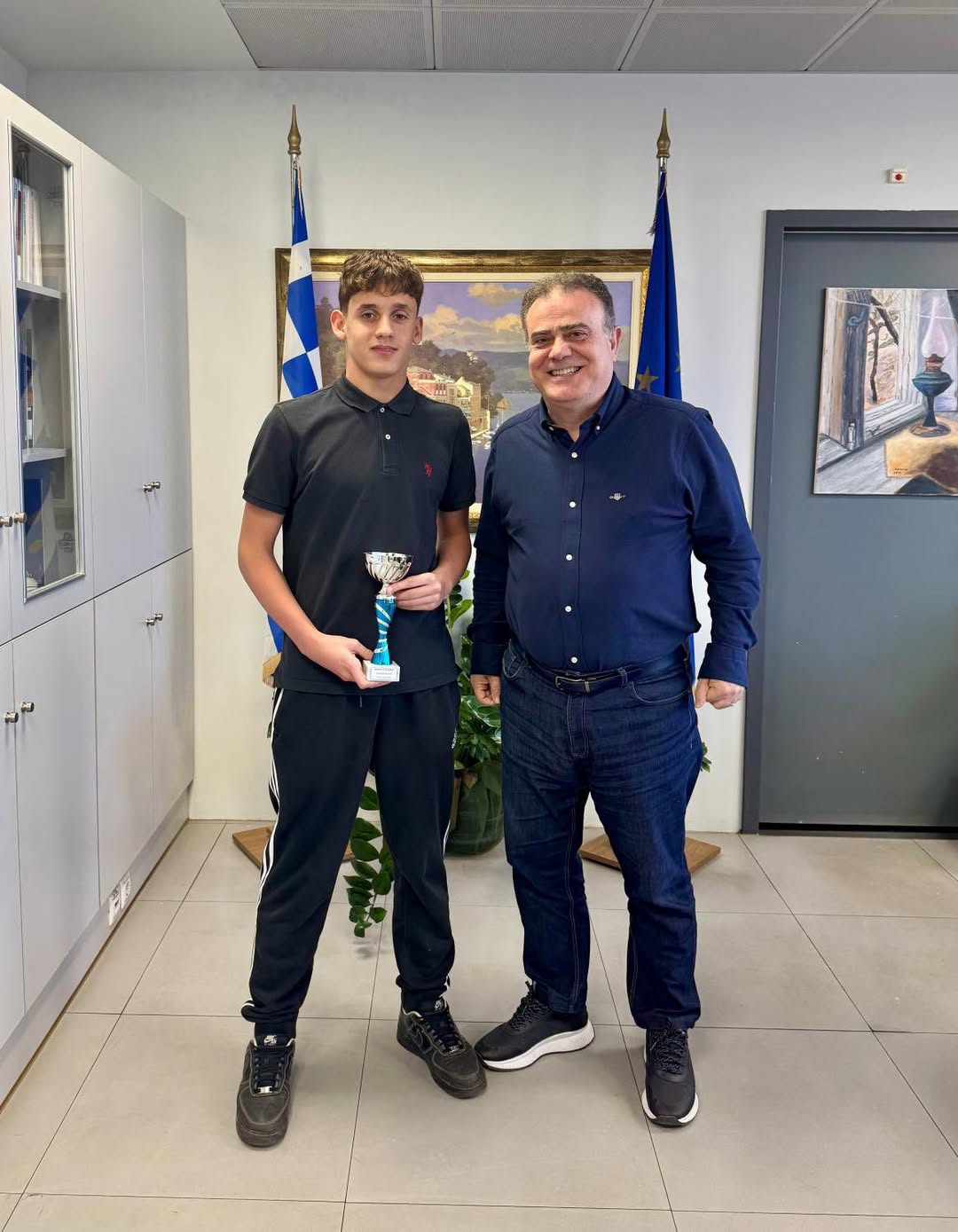 Αναμνηστική βράβευση από τον Δήμαρχο Παλλήνης, Χρήστο Αηδόνη, στον 15χρονο αθλητή υδατοσφαίρισης του Α.Ο «Νηρέα» Γέρακα, ο οποίος ανέσυρε τον Τίμιο Σταυρό στα Θεοφάνια.