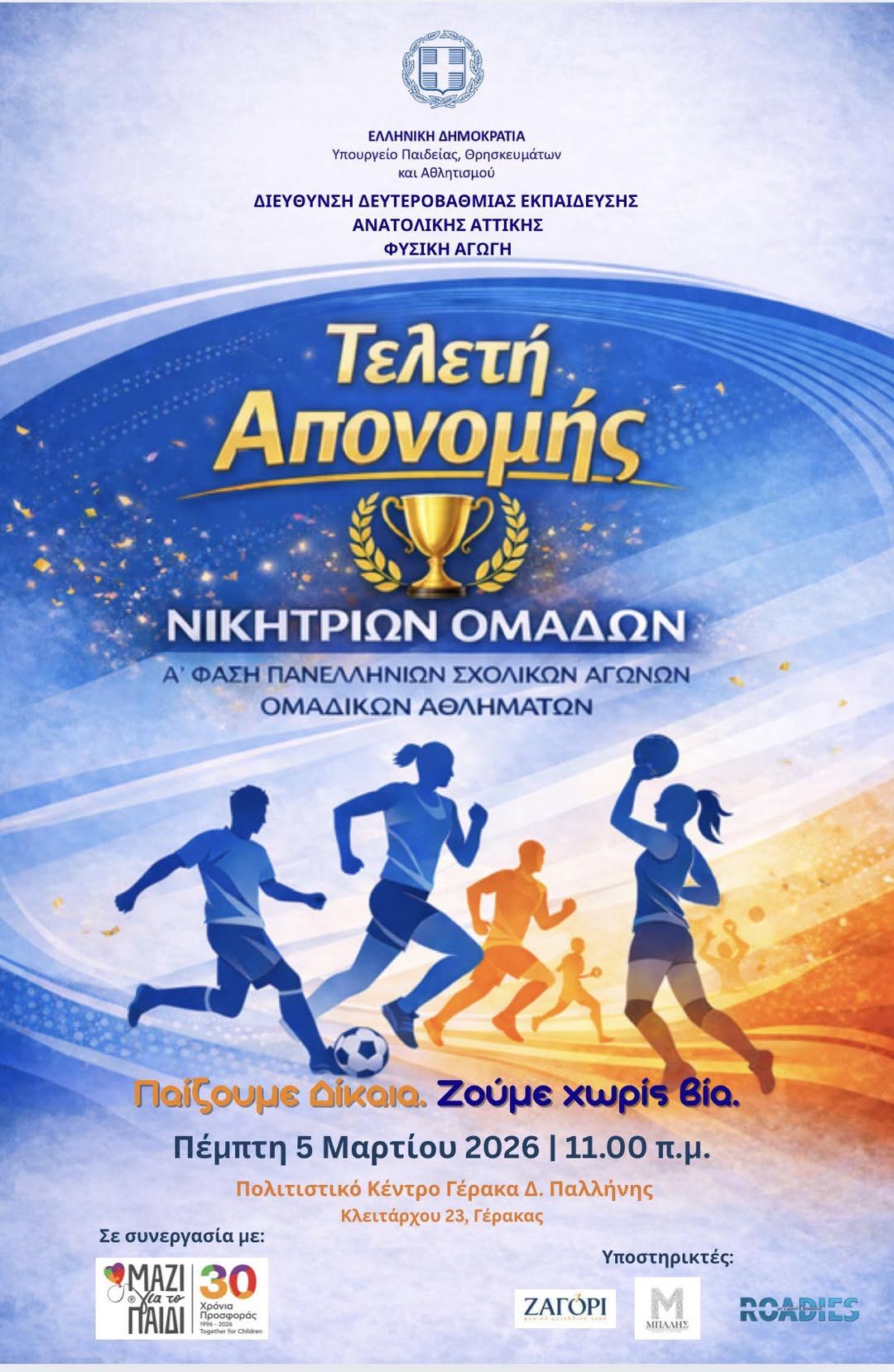 05.03.2026: Τελετή Απονομής Νικητριών Ομάδων Α’ Φάσης Πανελλήνιων Σχολικών Αγώνων 2025–2026, στο Πολιτιστικό Κέντρο Γέρακα.