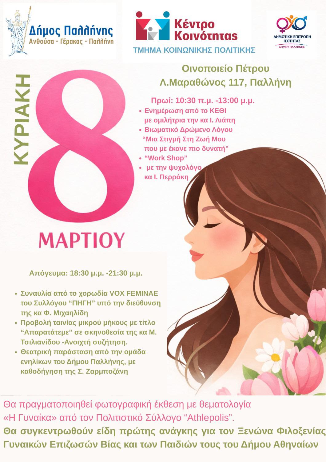 08.03.2026: Ο Δήμος Παλλήνης τιμά την Παγκόσμια Ημέρα της Γυναίκας με εκδήλωση στο «Οινοποιείο Πέτρου».