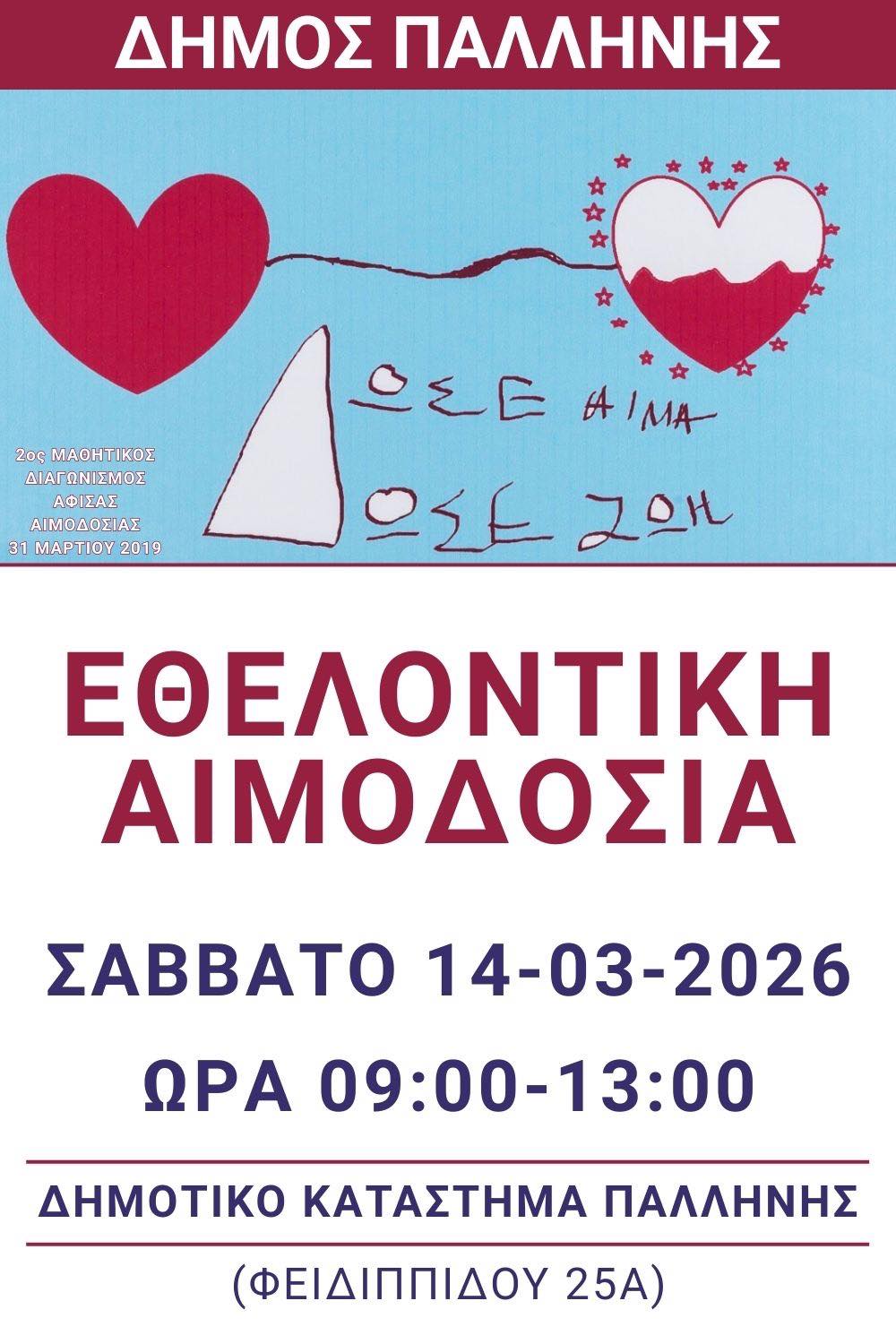 Εθελοντική Αιμοδοσία στο Δημαρχείο Παλλήνης – Σάββατο 14 Μαρτίου, 09:00–13:00.