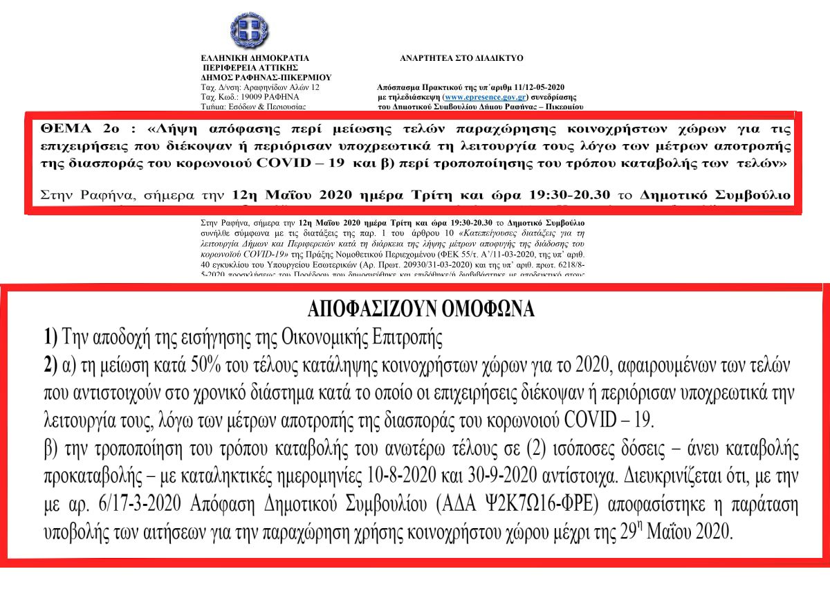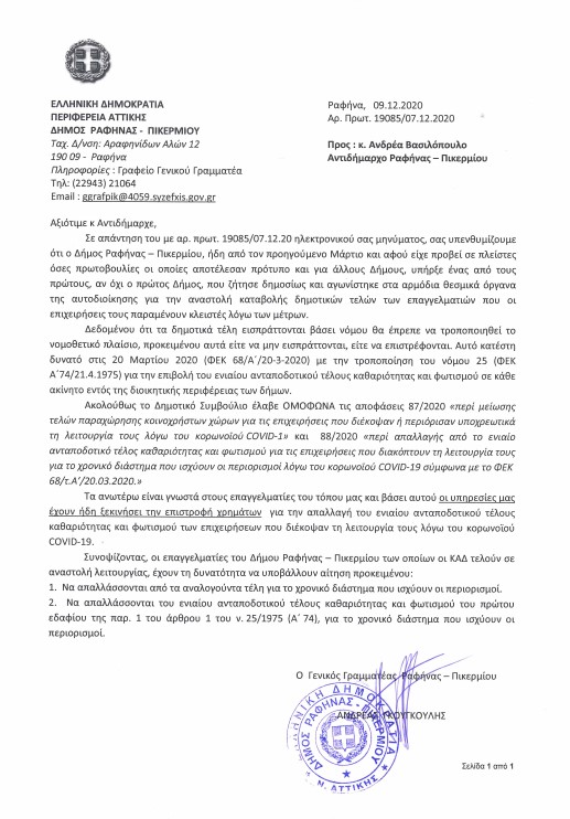 Επειδή προκλήθηκε πολύς θόρυβος από το πρωί από την απάντηση του Γενικού Γραμματέα του δήμου Ραφήνας Πικερμίου κ. Γκουγκουλή, σχετικά με την επιστολή μου στην οικονομική επιτροπή, θέλω να πιστεύω ότι προφανώς λόγω φόρτου εργασίας ο κ. Γενικός, στην απάντησή του, περιορίστηκε μόνο στο να αναφέρει τις δύο ενέργειες που έχουμε κάνει ως Δημοτική Αρχή για τη στήριξη των επαγγελματιών και αφορούν στην απαλλαγή τελών.
