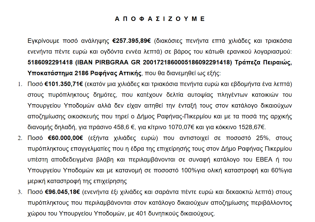 1. Ποσό €101.350,71€ (εκατόν μια χιλιάδες και τριακόσια πενήντα ευρώ και εβδομήντα ένα λεπτά) στους πυρόπληκτους δημότες, που κατέχουν δελτία αυτοψίας πληγέντων κατοικιών του Υπουργείου Υποδομών αλλά δεν είχαν αιτηθεί την ένταξή τους στον κατάλογο δικαιούχων αποζημίωσης οικοσκευής που τηρεί ο Δήμος Ραφήνας-Πικερμίου και με τα ποσά της αρχικής διανομής δηλαδή, για πράσινο 458,6 €, για κίτρινο 1070,07€ και για κόκκινο 1528,67€.