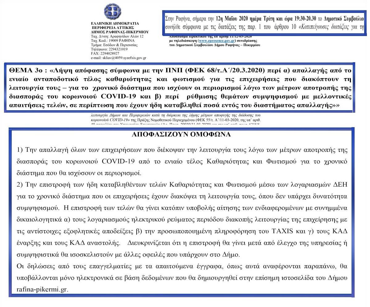 ? Παράλληλα δίδεται παράταση μέχρι τις 28/2/2021, στην προθεσμία καταβολής δόσεων από ρυθμισμένες οφειλές στο Δήμο Ραφήνας-Πικερμίου, λόγω των έκτακτων συνθηκών από την πανδημία COVID-19.