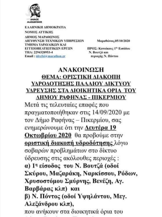 Ο Δήμος Ραφήνας Πικερμίου μετά την αδιανόητη απόφαση του Δήμου Μαραθώνα να «σφραγίσει» αυτή τη φορά το μέρος του αγωγού που υδροδοτεί επί 10ετίες τους κατοίκους του Νέου Πόντου , αφήνοντας κυριολεκτικά 10δες οικογένειες της πυρόπληκτης περιοχής χωρίς νερό, προχωρά με την Υπηρεσία Ύδρευσης από σήμερα Κυριακή 11/10/2020 σε μια ύστατη προσπάθεια να παράσχει μέσω του δικού του δικτύου νερό στους κατοίκους που αφέθηκαν στην τύχη τους.