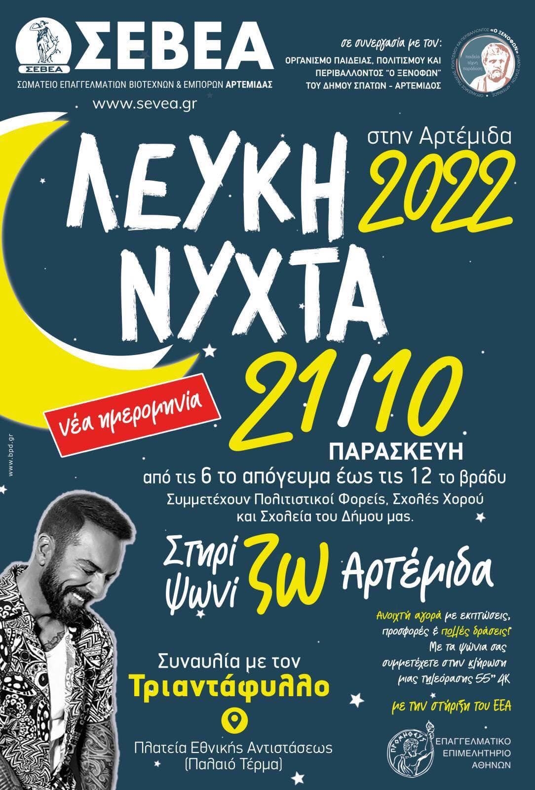 Σήμερα, Παρασκευή 21 Οκτωβρίου στις 18:00 ανοίγει η αυλαία για την "ΛΕΥΚΗ ΝΥΧΤΑ" στην Αρτέμιδα με τον Τριαντάφυλλο να "σπάει τα ρολόγια" σε μία ξεχωριστή φαντασμαγορική βραδιά με μουσική, χορό, fire show, γεύσεις και ποικιλία προϊόντων των τοπικών καταστημάτων σε ξεχωριστές - ειδικές τιμές.
