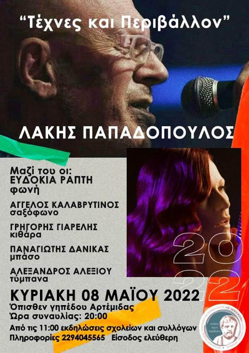 Υ.Γ. Επόμενο ραντεβού την Κυριακή 8 Μαίου με την εκδήλωση «ΤΕΧΝΕΣ & ΠΕΡΙΒΑΛΛΟΝ» με συναυλία με τον αγαπημένο καλλιτέχνη Λάκη Παπαδόπουλο.
