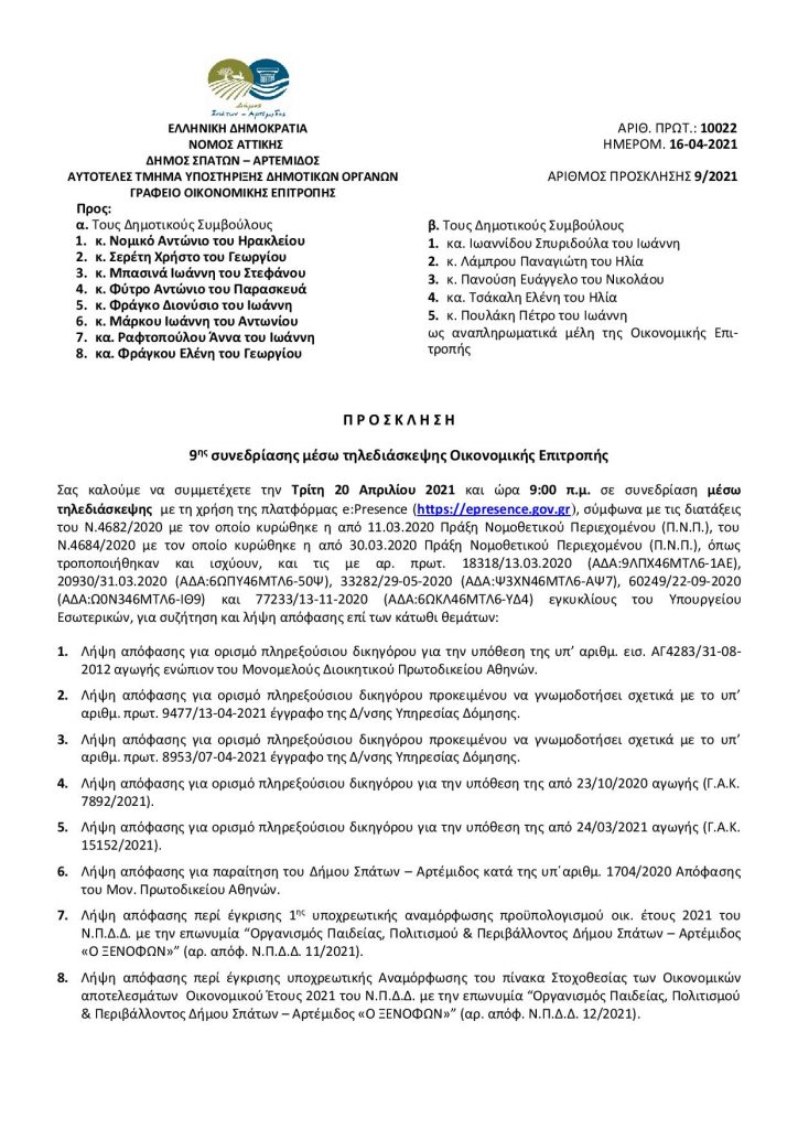 Με 29 θέματα συνεδριάζει αύριο Τρίτη 20/4 η Οικονομική Επιτροπή Δήμου Σπάτων Αρτέμιδος