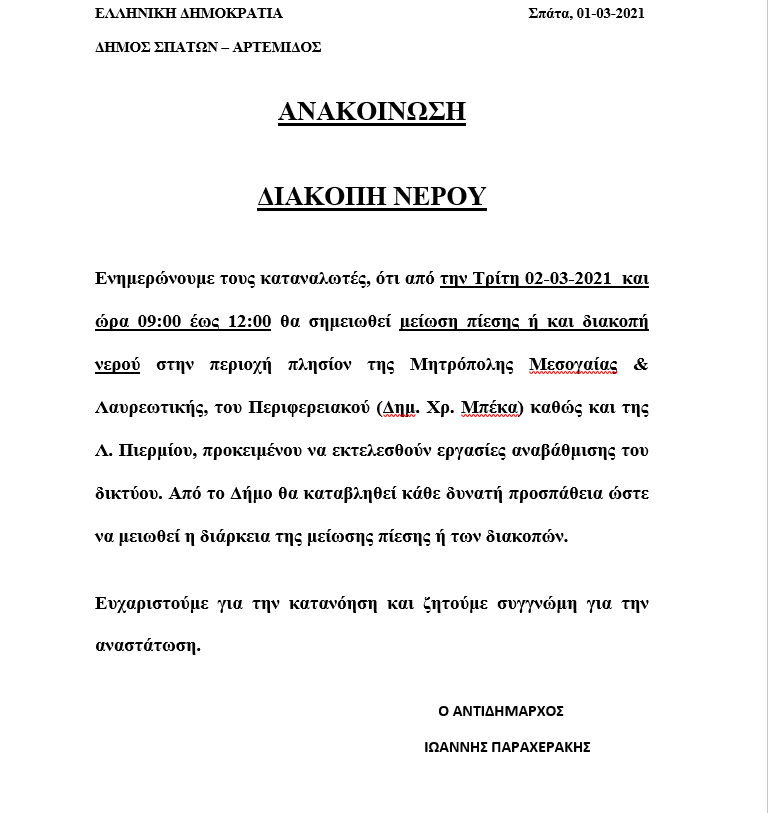 Το «πράσινο» φως για την εκπόνηση της μελέτης αποχέτευσης αστικών λυμάτων Νότιας Αρτέμιδας με χρηματοδότηση της Περιφέρειας Αττικής, ύψους περίπου 850.000 ευρώ, δόθηκε μετά την υπογραφή της σχετικής Προγραμματικής Σύμβασης μεταξύ του Περιφερειάρχη Γ. Πατούλη και του Δημάρχου Σπάτων-Αρτέμιδας Δ. Μάρκου.
