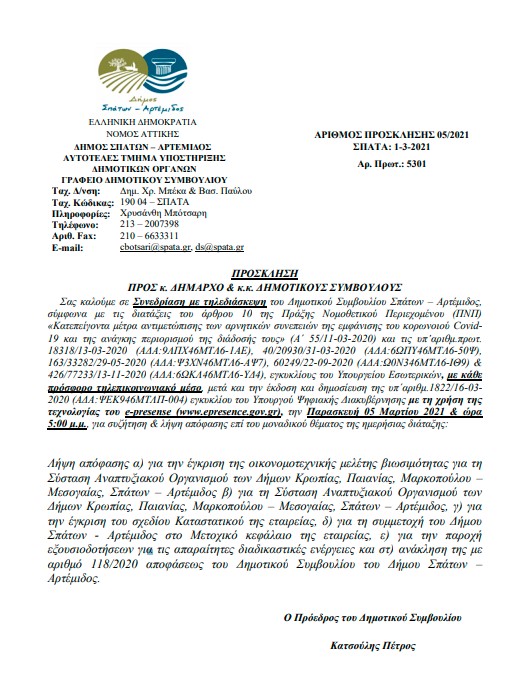 Σας καλούμε σε Συνεδρίαση με τηλεδιάσκεψη του Δημοτικού Συμβουλίου Σπάτων – Αρτέμιδος, σύμφωνα με τις διατάξεις του άρθρου 10 της Πράξης Νομοθετικού Περιεχομένου (ΠΝΠ) «Κατεπείγοντα μέτρα αντιμετώπισης των αρνητικών συνεπειών της εμφάνισης του κορωνοιού Covid19 και της ανάγκης περιορισμού της διάδοσής τους» , εγκυκλίους του Υπουργείου Εσωτερικών, με κάθε πρόσφορο τηλεπικοινωνιακό μέσο, μετά και την έκδοση και δημοσίευση εγκυκλίου του Υπουργού Ψηφιακής Διακυβέρνησης με τη χρήση της τεχνολογίας του e-presense (www.epresence.gov.gr), την Τρίτη 23 Μαρτίου 2021 & ώρα 5:00 μ.μ., για συζήτηση & λήψη απόφασης επί του μοναδικού θέματος της ημερήσιας διάταξης: Επιλογή Συμπαραστάτη του Δημότη & της Επιχείρησης (άρθρο 77).