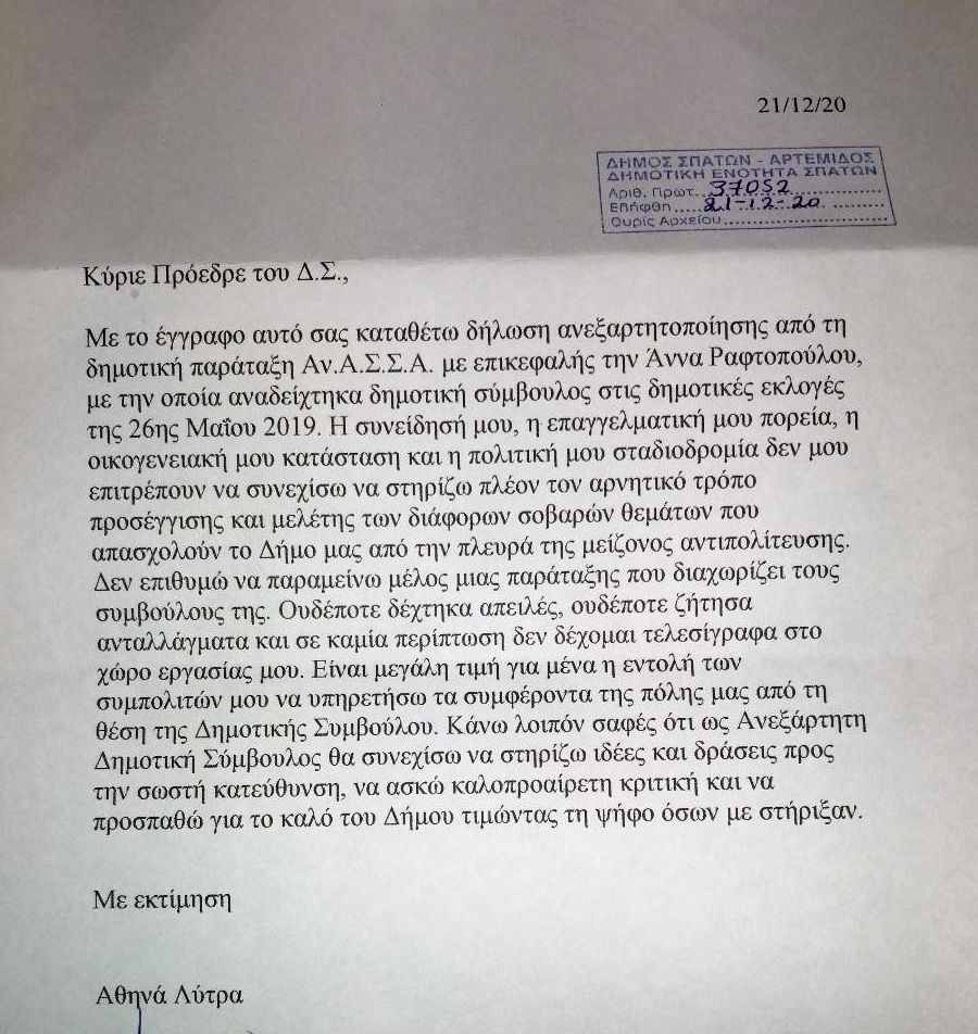 Η συνείδησή μου και η ιδεολογία μου δεν ταυτίζονται πλέον με τον τρόπο προσέγγισης και μελέτης των διαφόρων σοβαρών θεμάτων αλλά και με την τακτική που υιοθετεί η πλειοψηφία της δημοτικής παράταξης “ΑΝΑΝΕΩΤΙΚΗ ΑΝΕΞΑΡΤΗΤΗ ΣΥΜΜΑΧΙΑ ΣΠΑΤΩΝ ΑΡΤΕΜΙΔΟΣ - ΑΝ.Α.Σ.Σ.Α”.