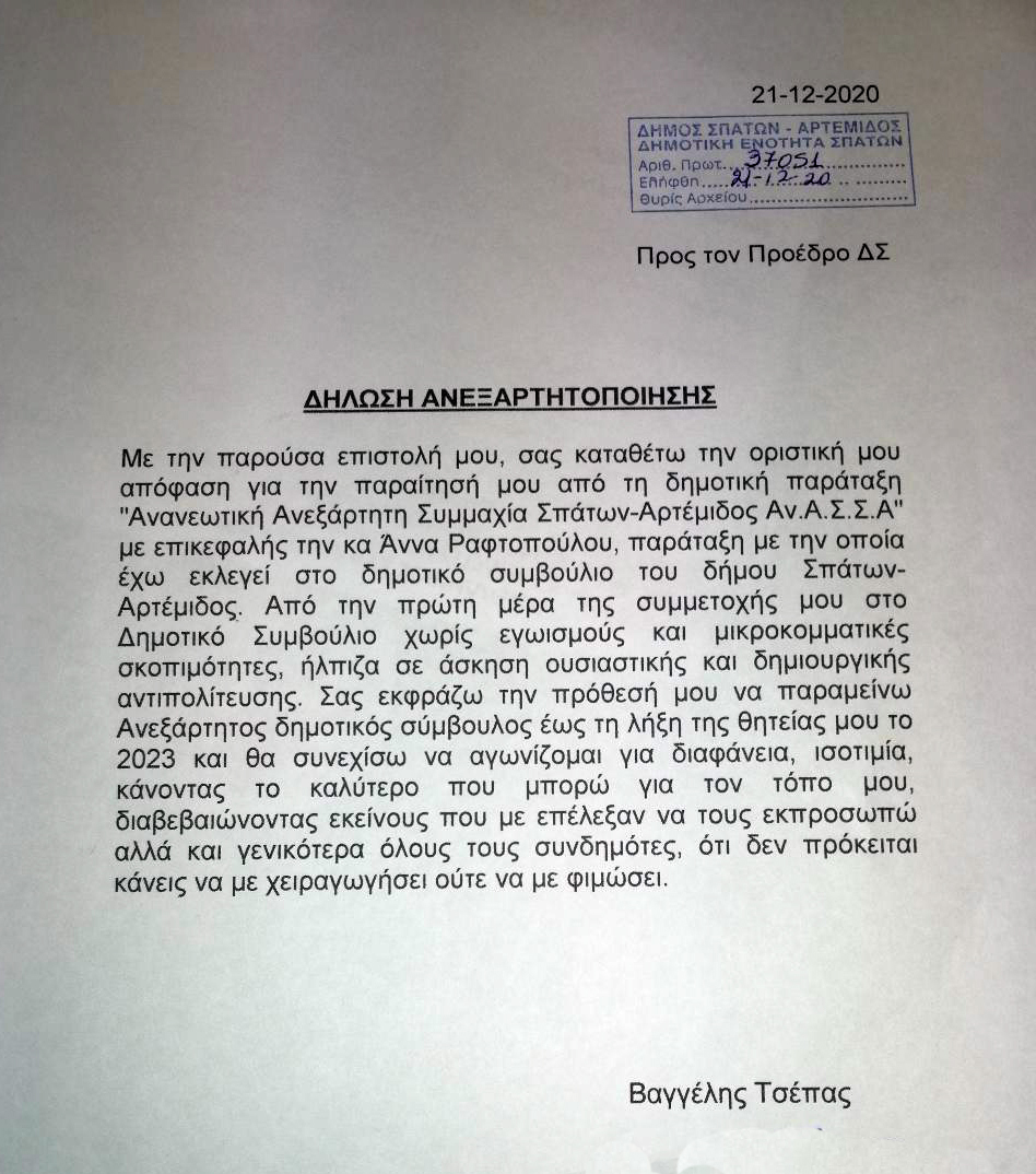 Τη δήλωση ανεξαρτητοποίησης μου απέστειλα σύμφωνα με το νόμο, πριν από την έναρξη του Δημοτικού Συμβουλίου της 21ης Δεκεμβρίου 2020, στον κ. Πρόεδρο του Δημοτικού Συμβουλίου, η οποία έλαβε αριθμό πρωτοκόλλου 3749/21-12-2020, ενώ επίσης την απέστειλα και στην κα Ραφτοπούλου.