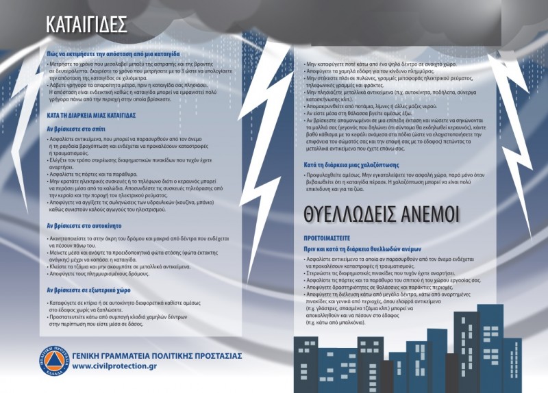 Για περισσότερες πληροφορίες και οδηγίες αυτοπροστασίας από τα έντονα καιρικά φαινόμενα, οι πολίτες μπορούν να επισκεφθούν την ιστοσελίδα της Γενικής Γραμματείας Πολιτικής Προστασίας στην ηλεκτρονική διεύθυνση www.civilprotection.gr και στο σύνδεσμο bit.ly/2XL7JWR.