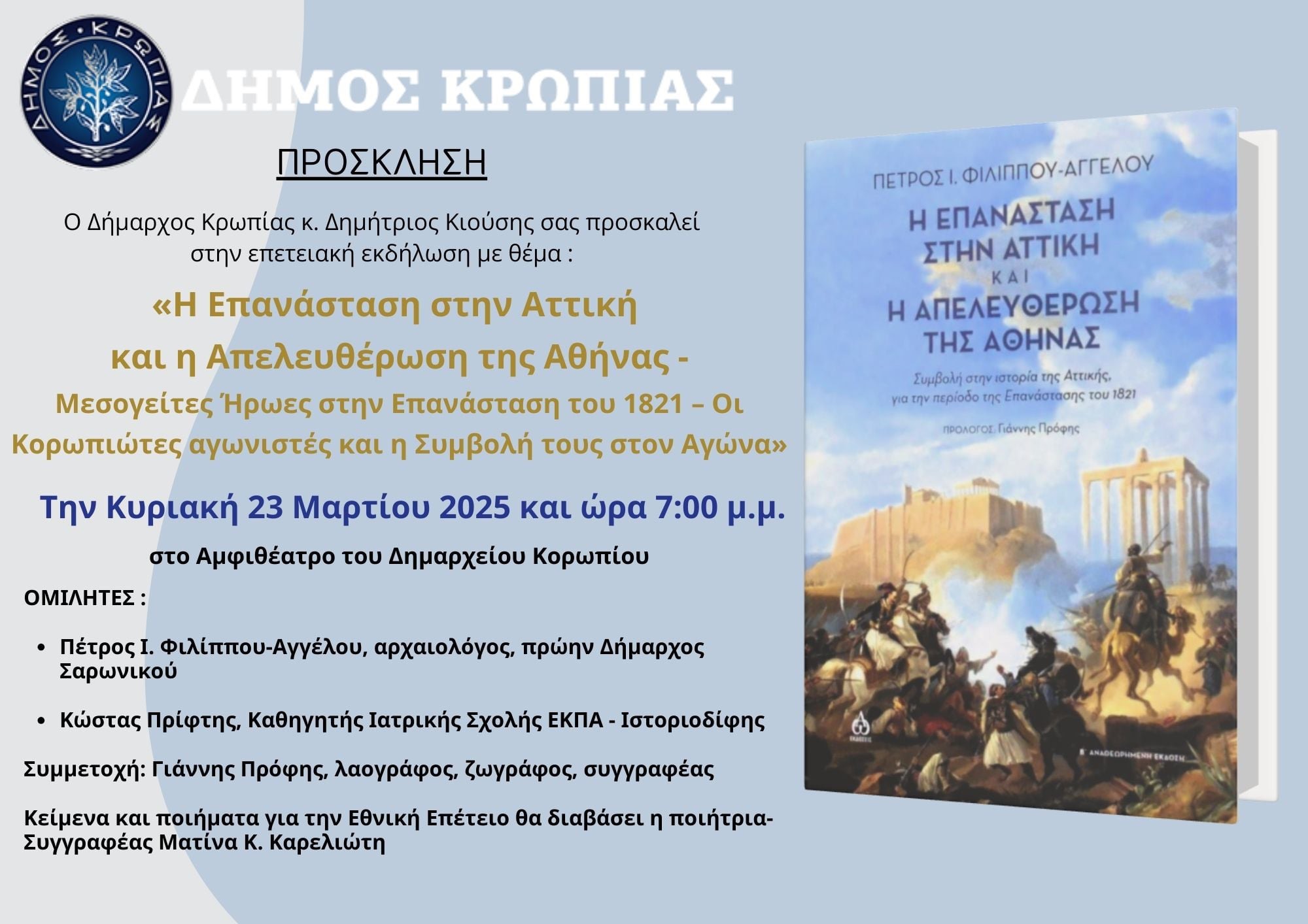 204η Επέτειος της Ελληνικής Επανάστασης του 1821 στο Δήμο Κρωπίας.Οι δημοτικές εκδηλώσεις της 204ης επετείου από την έναρξη της Ελληνικής Επανάστασης του 1821 είναι οι εξής :